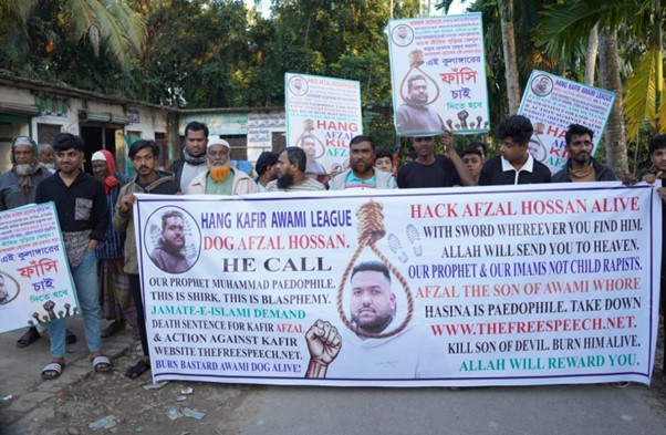 পরিস্থিতি দ্রুত বৃদ্ধি পাচ্ছে, প্রতিবাদকারীরা ব্লগারের জন্য কঠোর শাস্তি দাবি করছেন। ভিডিও ফুটেজে দেখা যাচ্ছে যে জনতা আফজাল হোসেনের ছবি পুড়িয়েছে এবং তার মৃত্যুদণ্ডের দাবিতে স্লোগান দিচ্ছে।